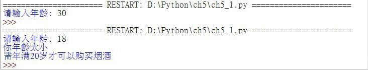 上述在讲解if语句是True时,需缩进4个字符空间,读者可能会问可不可以缩进5个字符空间,答案是可以的。但是记得相同程序段必须有相同的缩进空间。如果你是使用Python的IDLE编辑环境,当输入if语句后,只要按Enter键,编辑程序会自动缩进4个字符空间。
