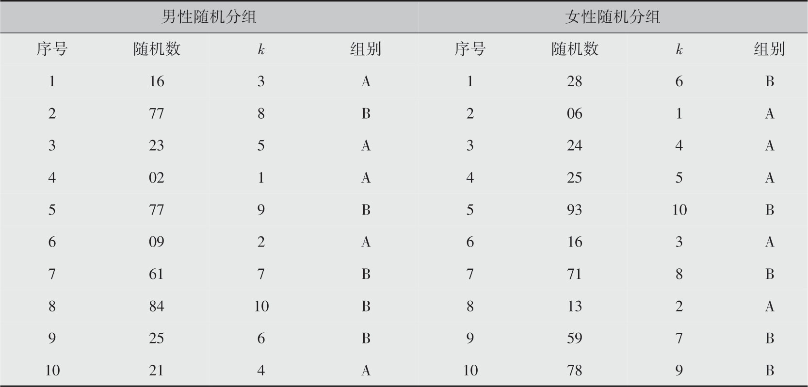 【例5-3】将男、女各10 名患者按照性别分层后随机等分为2 组,见表5-3。按例5-1 的方法查随机数字表,规定随机排列序号 k 对应处理因素, k 1~5 为A 组, k 6~10为B 组,得到各层的分组结果。