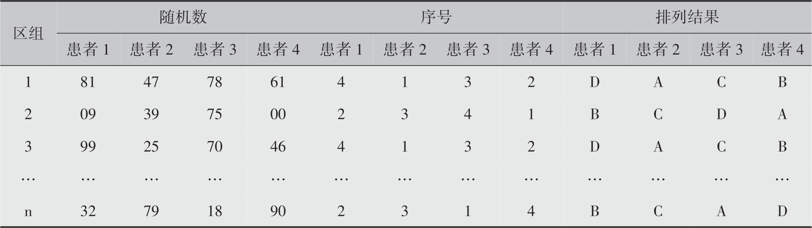【例5-2】将24 例患者以年龄相近的4 名患者作为一个区组,试将24 名患者分配到不同处理组。方法:①将患者按年龄分区组;②从随机数字表任意选择起始数,依次读取两位随机数;③将每一区组的随机数从小到大进行排序;④序号从小到大依次对应A、B、C、D组。