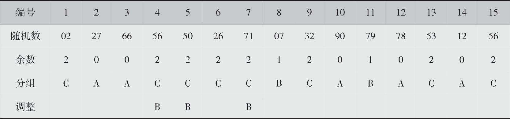【例5-1】将15 例患者按随机数字表法分成3组。方法:将15个患者依次编号1~15;从随机数字表中任意选择起始数,如第三行第三列开始,依次读取两位随机数分配给每个患者;将随机数字除以3 后记录余数,并规定余数为0 为A组,1为B 组,2为C组;当各组例数不等,如需将C组3 例调整到B组,续取随机数字下三个分别85、99、26,分别除以8,余数分别为5、3、2,则将C组第2、3、5 例调整到B组。