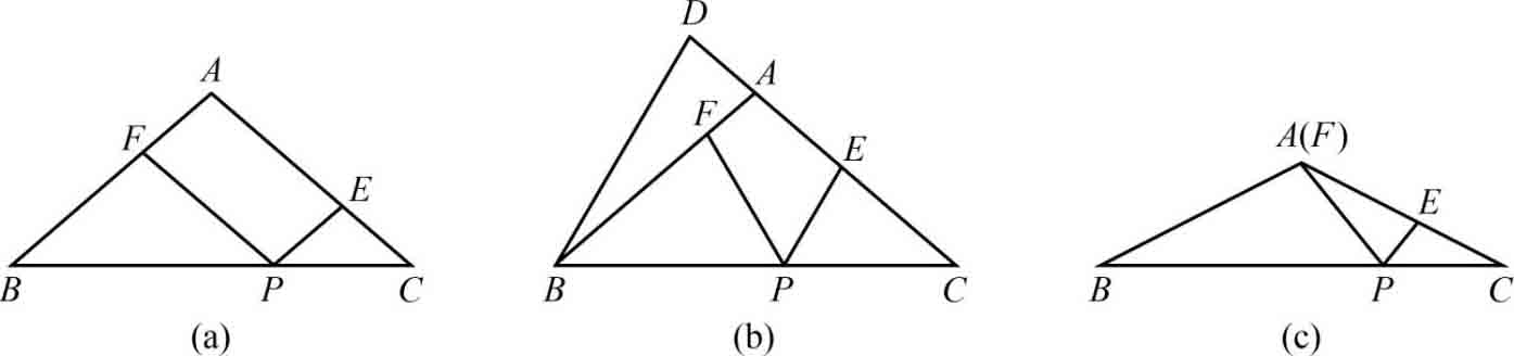 在△ ABC 中,∠ B =∠ C , P 是 BC 边上一点,作∠ CPE =∠ BPF ,分别交边 AC 、 AB 于点 E 、 F.