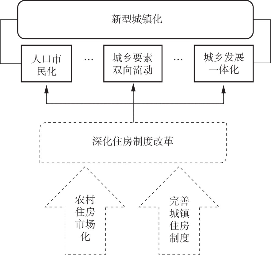 综上,深化住房制度改革是新型城镇化战略的必然要求,而农村住房市场化既有利于人口市民化,实现以人为本的城镇化,又有利于激活农村住房的资产功能,构建城乡要素双向流动机制,还有利于城乡住房融合和城乡发展一体化,因而是深化住房制度改革的必然方向(如图2-8所示)。