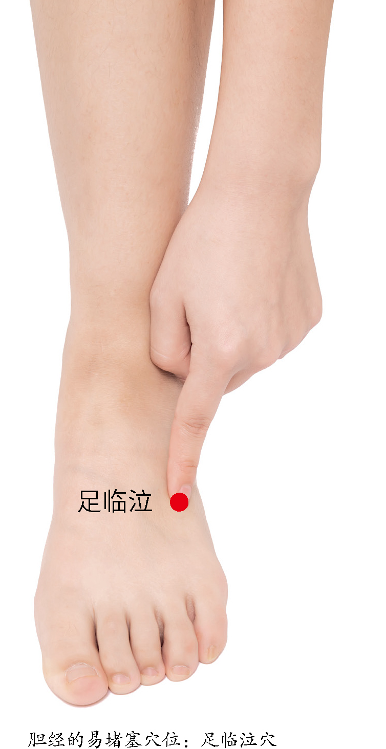 将食指放在第四脚趾和第五脚趾之间,然后直直地向上画线,画到脚面中央区域时,会找到一个缝隙,这里就是足临泣穴。