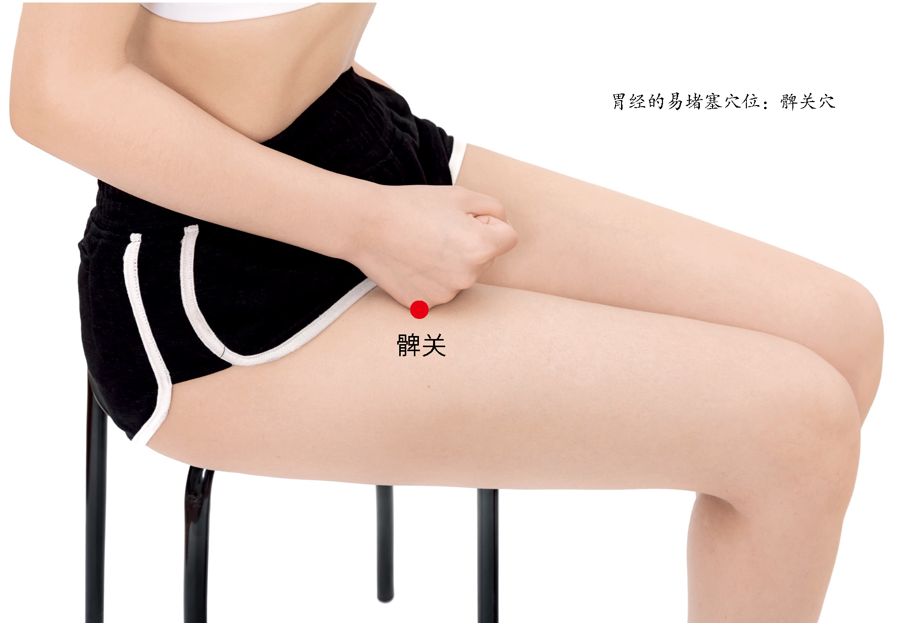 保持正坐位,双手握拳,用小指的掌指关节沿大腿正面中线从腿根一直敲击到膝关节,3~5遍以后,在腹股沟中点下方三指宽处会发现一个强烈的痛点,这就是胃经在大腿部的易堵点——髀关穴。