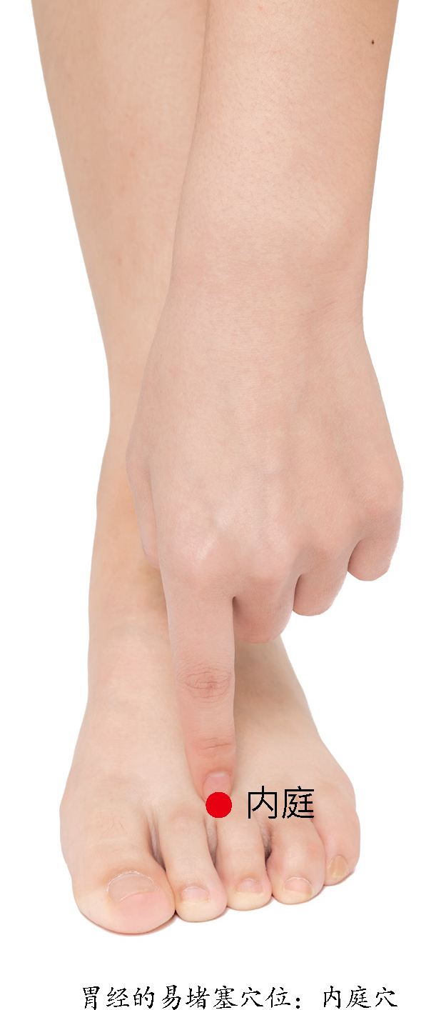 内庭穴在二脚趾和三脚趾之间的趾蹼缘上。用食指进行点按,以最小的半径旋转打圈,逐渐加力,有的朋友疼痛难当。