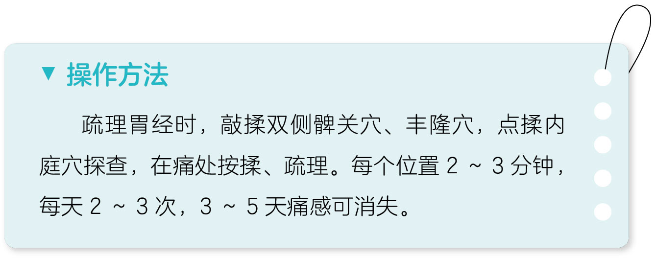 丰隆穴在小腿中点,胫骨外两横指宽处。用大拇指的指间关节进行敲揉,会有强烈痛感。