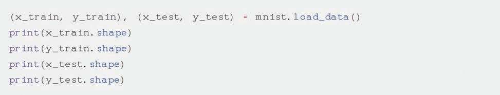 使用Keras的mnist模块下载MNIST数据集,数据集已经被分为训练数据与测试数据,分别包含了输入x(图像)和输出y(对应的数字)。我们将四个数据集的形状打印出来。