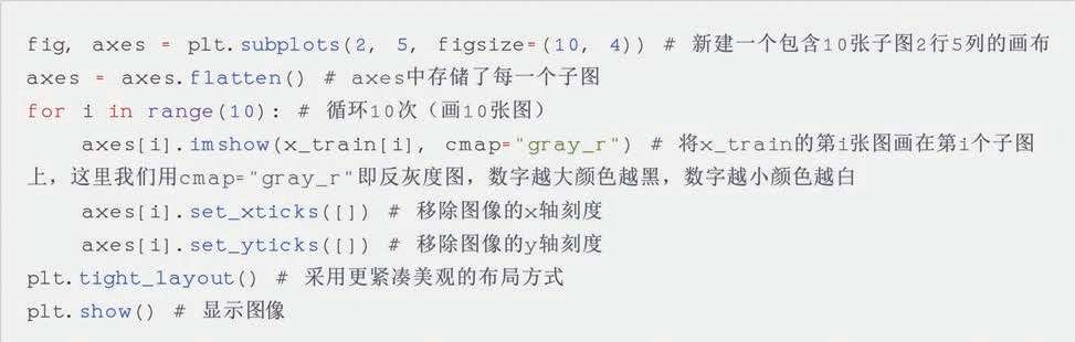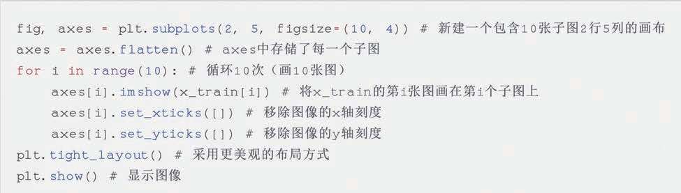 我们将训练数据中的前10张图像画出来。(有关matplotlib库的详细用法在本书中不作展开,如果感兴趣可以搜索相关教程。)