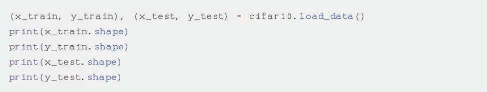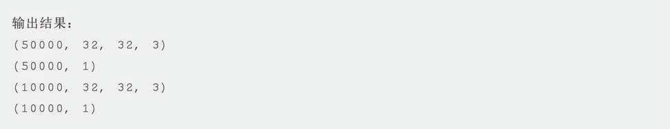 从输出结果中,可以看出CIFAR—10数据集中包含了50000个训练数据与10000个测试数据。与MNIST数据集不同,CIFAR—10数据集中的图像是RGB格式的彩色图像,每张图像大小为32×32×3,即每张图像含有32×32=1024个像素点,而每个像素点由3个数字组成,分别代表红色、绿色、蓝色通道。输出的y依然由一个数字表示,0~9这10个数字分别代表10类物体。