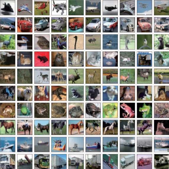 可以看到CIFAR—10数据集中的每一类物体都有形状、颜色、拍摄角度不同的图像,并且图像中还含有一些不相关的元素。