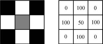 计算机中的图像主要有两种—位图和矢量图(矢量图在本书中不做介绍)。其中位图是使用像素矩阵来表示图像的一种方法。我们可以把图像分割成一个个小方块,每一个小方块就是一个像素。我们常听到的广告语“2000万像素,照亮你的美”,所表达的就是图像含有2000万个小方块。每一个像素都可以描绘一些信息,通常像素越高,图像包含的信息就越多,图像也就越清晰。以黑白照片为例,对于其上每一个像素,都可以用一个数来描述它的灰度(或者亮度)。如果把纯白色记作100,纯黑色记作0,不同的灰色用一个1~99之间的数字表示,这样就把一张图像转化成了一个矩阵,如下图所示。通常灰度会用0~255中的一个数字来表示,这里为了方便理解所以我们用了0~100来举例。