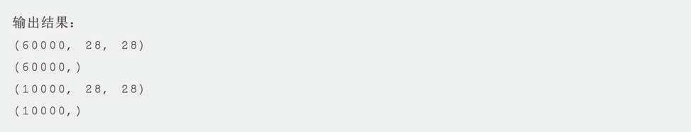 从x_train和y_train的形状可以看出训练数据中包含了60000个数据点。其中输入x是60000张用28×28=784像素组成的图像。由于MNIST数据集是灰度图,所以每个像素仅由一个数字表示。输出y是60000个数字,代表了每一张图像对应的数字。测试数据x_test和y_test中则包含了10000个数据点。