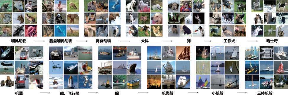 如果说MNIST数据集将初学者领进了深度学习领域,那么ImageNet数据集对深度学习的浪潮就起了巨大的推动作用。ImageNet数据集有1400多万张图像,涵盖2万多个类别,其中有超过百万的图像有明确的类别标注和图像中物体位置的标注。值得一提的是ImageNet数据集中的类别是层次化的,例如动物这个大类可分为哺乳动物、鸟类等子类,哺乳动物又可以往下细分子类。另外,ImageNet数据集中图像的平均分辨率为400×350,远远高于MNIST和CIFAR—10数据集。由于ImageNet数据集非常大,我们就不下载到本地用代码查看了,这里我们可以通过以下图像,对ImageNet数据有个基本的认识。