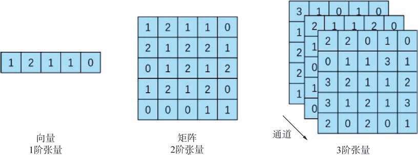张量:张量是一种更广义的概念。如果我们希望排列方式不仅有行和列,还有更多的维度,那么就需要用到张量。向量实际上就是一阶张量,矩阵就是二阶张量,如下右图是一个三阶张量,它的大小是(5,5,3)。三阶张量可以用来描述RGB彩色图。