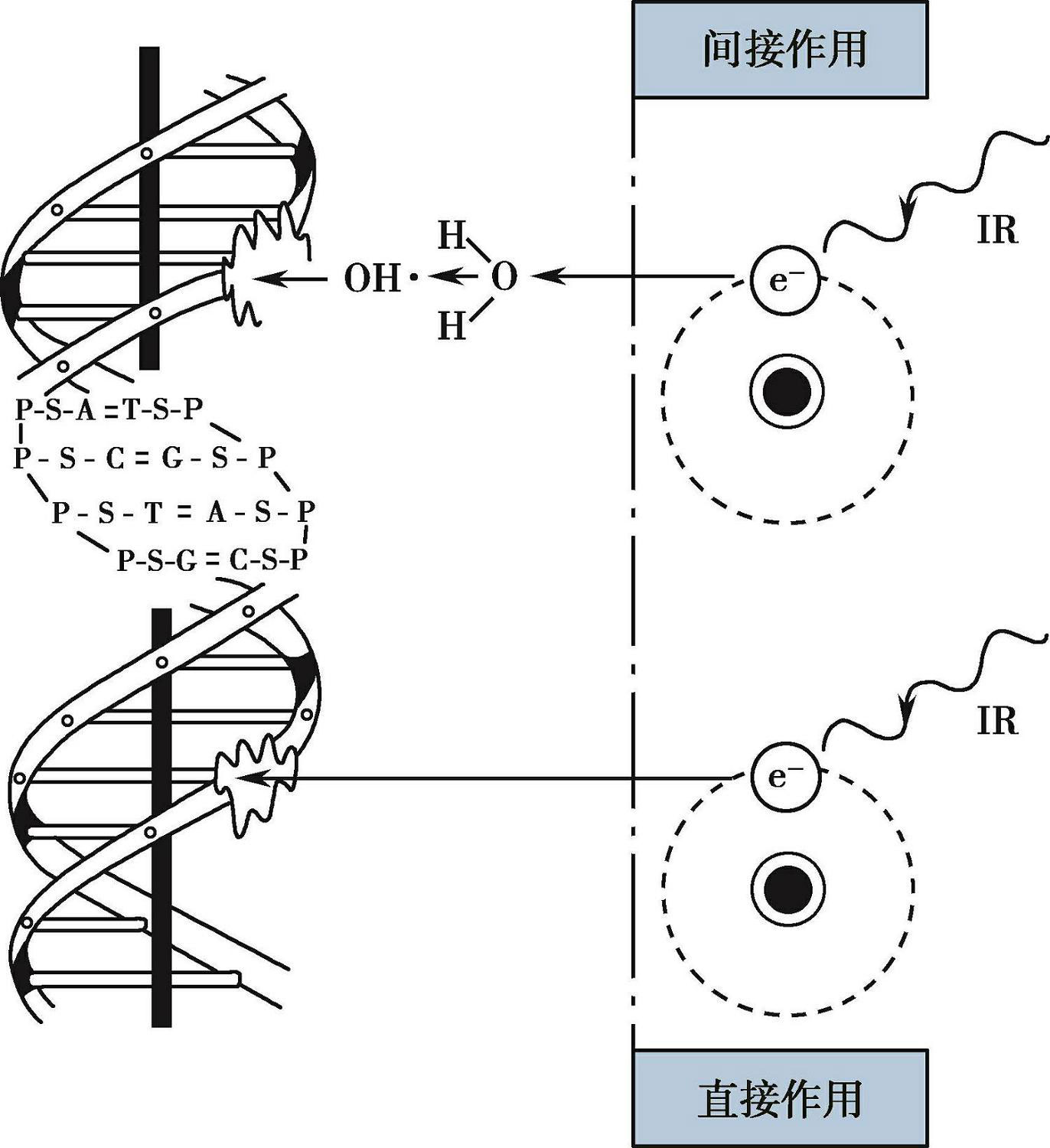 图1-1-1 电离辐射对DNA分子的直接作用和间接作用