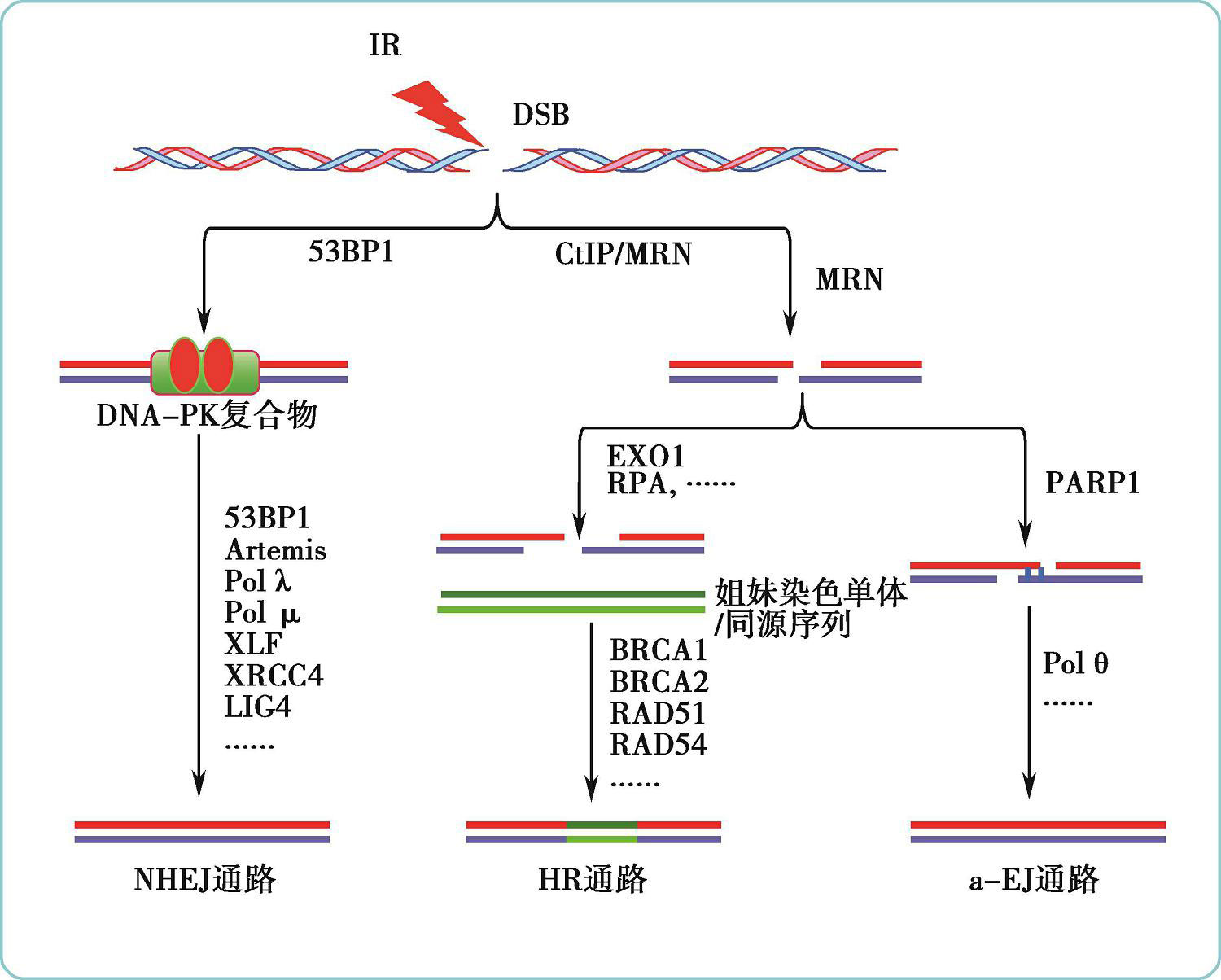 真核细胞DNA双链断裂修复通路有非同源末端连接(non-homologous end joining,NHEJ)、同源重组修复(homologous recombination,HR)和末端连接替代途径(Alternative end joining,a-EJ)等(图1-1-2),主要是NHEJ和HR修复通路。比较多的学者认为同源重组修复是酵母细胞中的主要修复机制,而非同源末端连接是哺乳动物细胞中的主导修复机制。但是近年来发现,同源重组修复在哺乳动物细胞中,特别是在晚S期和G 2 期中发挥了重要作用。