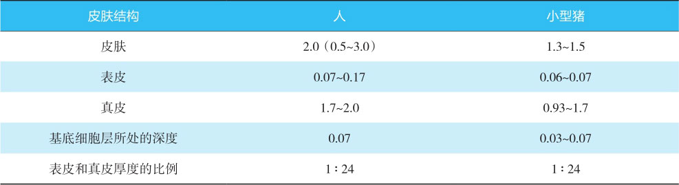 猪作为一种最常见的用来研究皮肤辐射损伤综合征的大型动物模型,被广泛运用于放射性皮肤损伤研究探索。由于猪的消化道、免疫系统等解剖和生理以及营养代谢均与人类相似,加上许多小型猪和无菌猪的育成,便于供应实验室应用,以猪作为实验动物模型的报道日益增多。猪和人的皮肤组织结构很相似,上皮再生修复性类似,皮下脂肪层和损伤后内分泌代谢的改变也相似,通过实验证明2、3月龄小猪的皮肤解剖生理特点最接近于人,包括体表毛发的疏密,表皮厚薄,表皮具有的脂肪层,表皮形态学和增生动力学(猪30天,人21天),损伤皮肤的体液和代谢变化机制等(表3-3-1)。