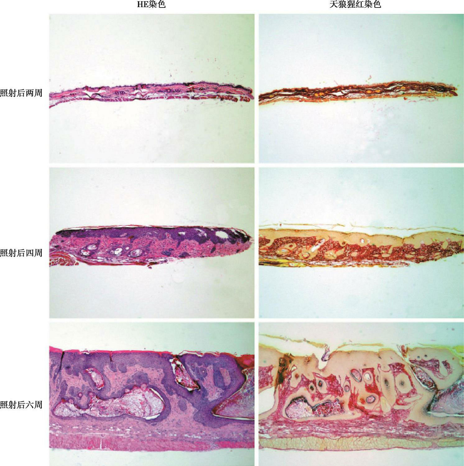 按实验所需时间点处死动物,快速取出组织,脱水透明,石蜡包埋,切片后行HE染色,观察表皮毛囊及血管结构、真皮层淋巴细胞浸润情况等。小鼠皮肤受照后HE染色及苦味酸染色显示其表皮及真皮结构紊乱,呈明显纤维化,见图3-3-2。