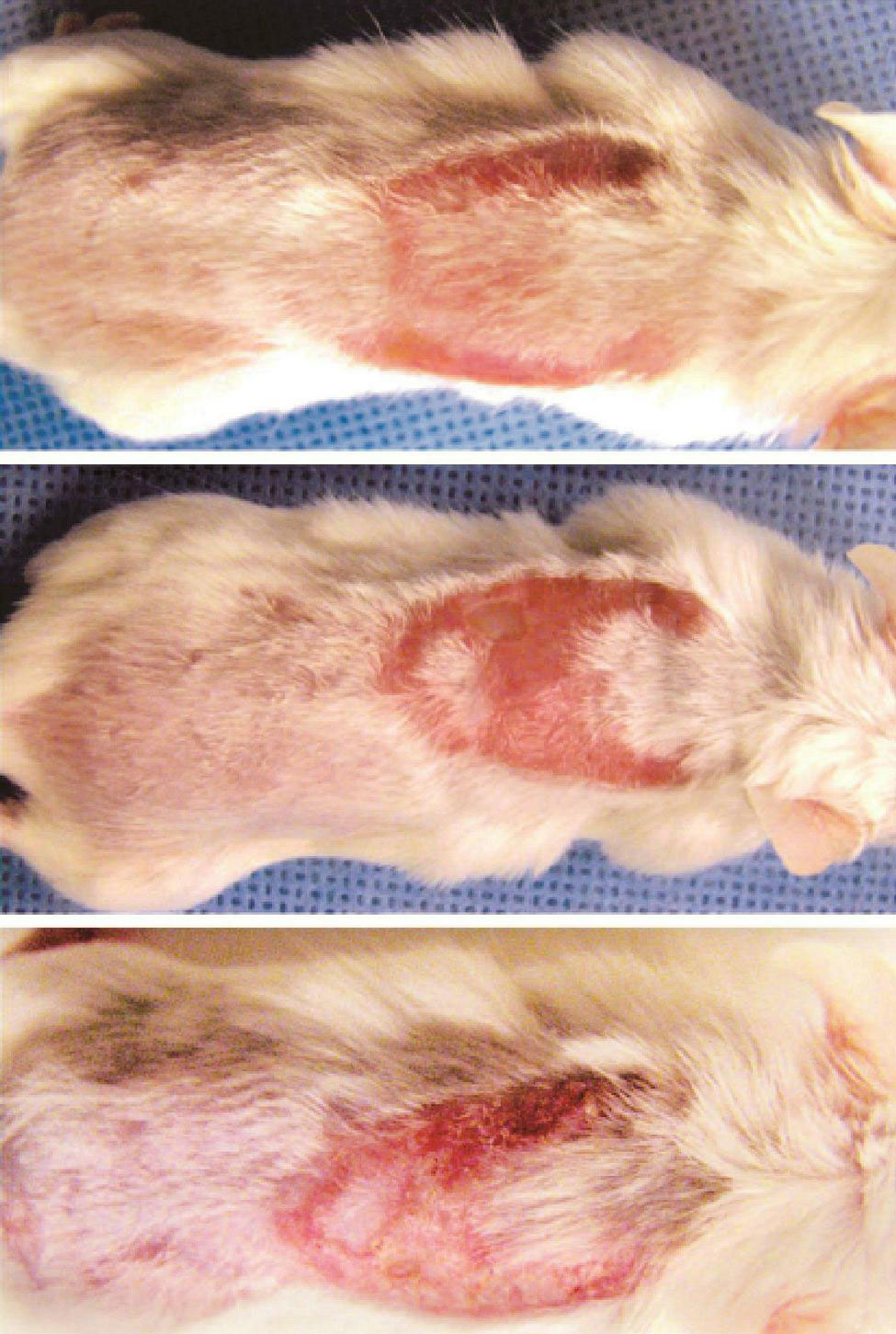 小鼠受照后,皮肤出现干性脱皮至湿性脱皮的变化过程,并呈现明显的水肿及溃疡,见图3-3-1。