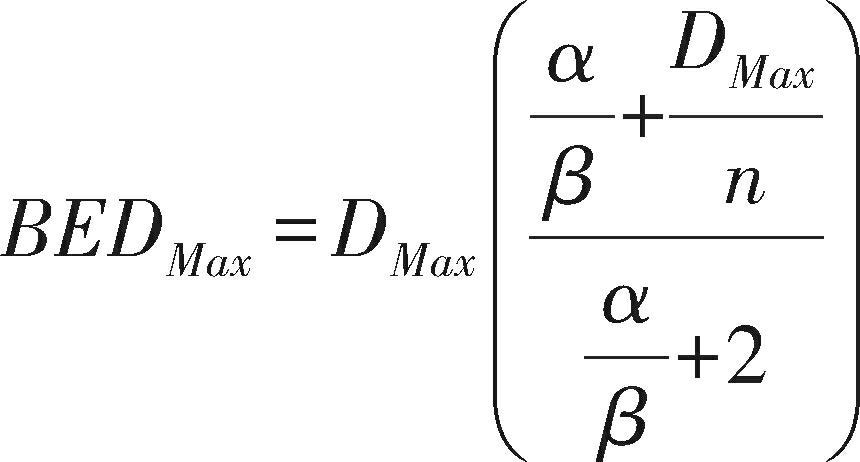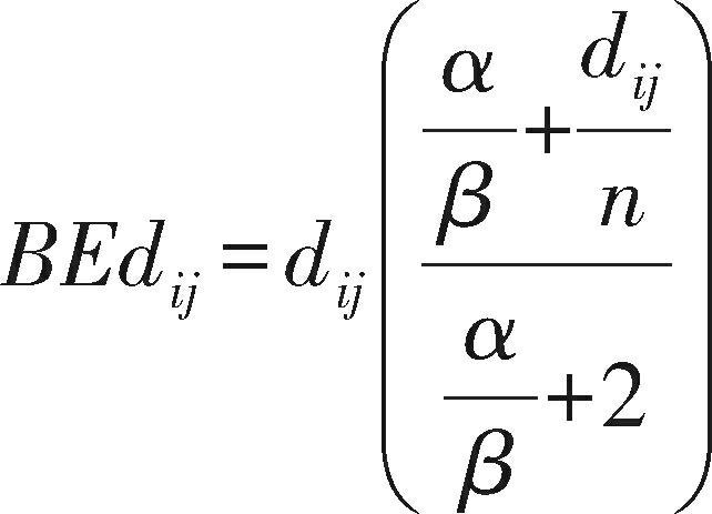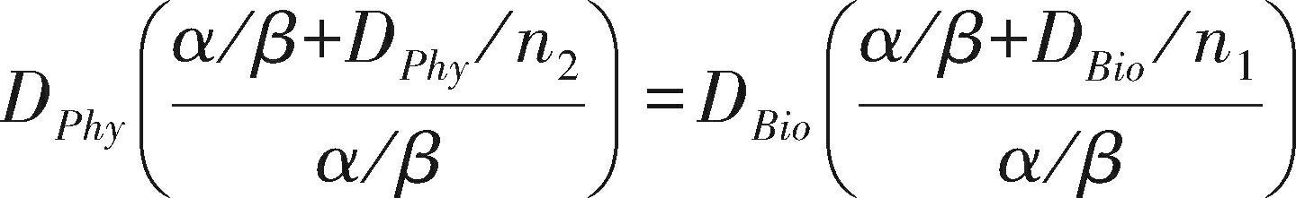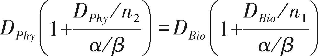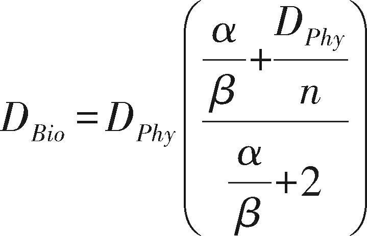 由于传统剂量分割模式中的分次剂量为2.0Gy/次,所以 D Bio / n 1 等于2,由此得到从物理剂量计算相应生物剂量的公式,如下