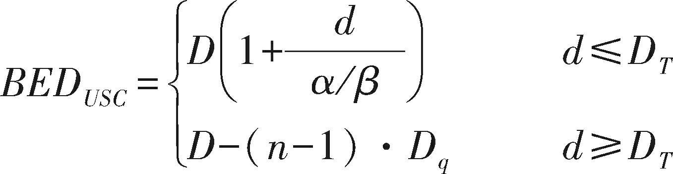Park等人通过对美国国家癌症研究院(NCI)报道的12种非小细胞肺癌细胞系的观察,得到了α、 D 0 和 D q 的算术平均值,分别为0.33Gy -1 、1.25Gy -1 和1.8Gy -1 。同时,转换剂量 D T 计算值为6.2Gy。Park等人还从USC模型推导出了计算生物效应剂量的公式如下: