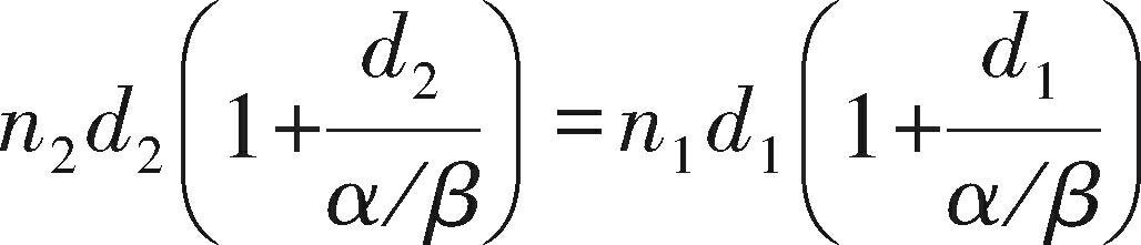 其中, nd 为总剂量( D );α/β比值称为分次剂量校正因子,可以查表获得。根据上述公式推导,不同分割方案的等效变换公式见式6-3-5: