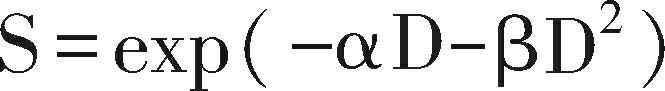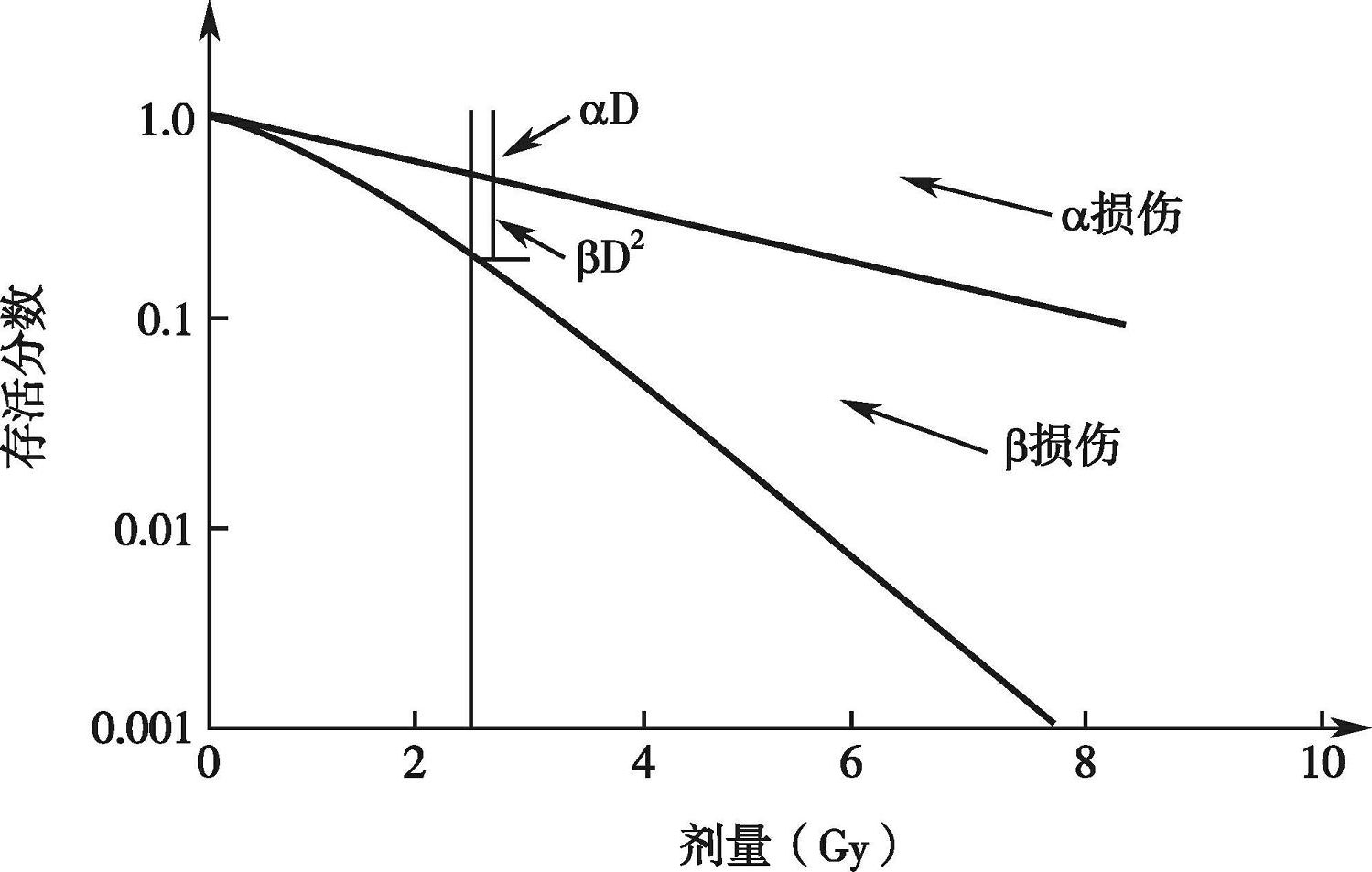 式中β为单位剂量平方的两个粒子使细胞被杀灭的平均概率,代表可修复的损伤。一束射线对细胞产生的总体效果,一定是既包含α损伤,又包含β损伤,所以总体细胞存活分数S表示为式6-3-1和式6-3-2的乘积