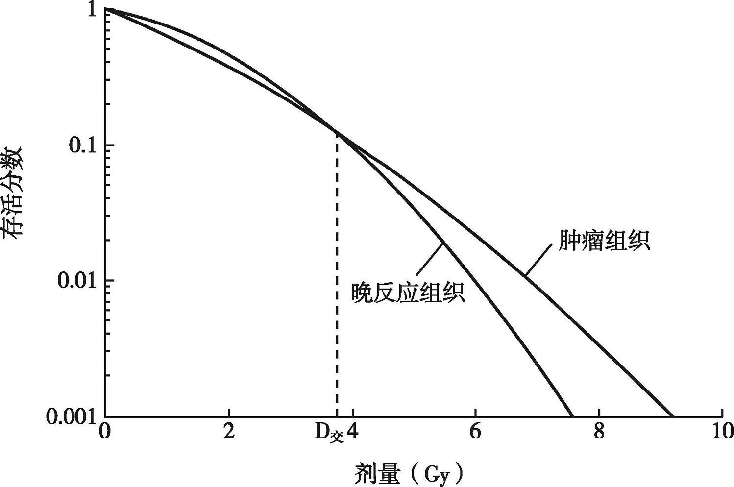 因此,两条曲线会在某一剂量处相交,相交点的剂量 D 交 与两种组织的L-Q特征参数有关,多数情况下 D 交 在2~5Gy的剂量范围内。在 D 交 左侧剂量区域内,晚反应组织(正常组织)的损伤较早反应组织(肿瘤)小,最佳照射剂量可能位于两种组织的细胞存活曲线相距最大的位置,该剂量一般约为交点剂量的50%。因此,常规分次照射的最佳分次剂量应位于1~2.5Gy范围内,这也正是在适形调强及影像引导放射治疗广泛应用之前,分次处方剂量往往位于1~2.5Gy之间的原因。