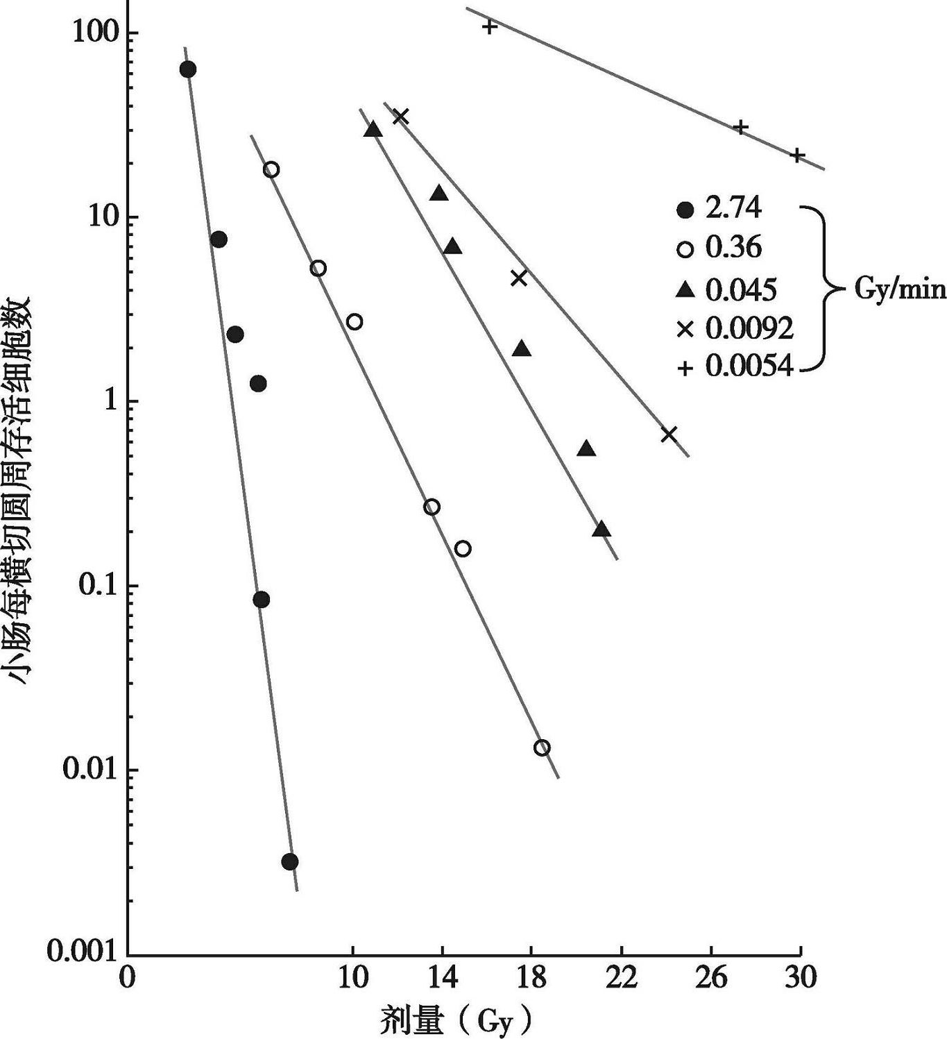 图6-3-5 用Cs 137 的γ射线在相当宽的剂量率范围内对小鼠做全身照射后观察小鼠小肠隐窝细胞的反应
