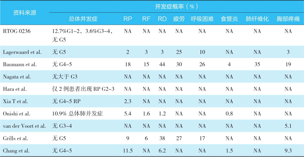 注释:RP:放射性肺炎;RF:肋骨骨折;RD:放射性皮炎;NA:不适用;G:并发症级别