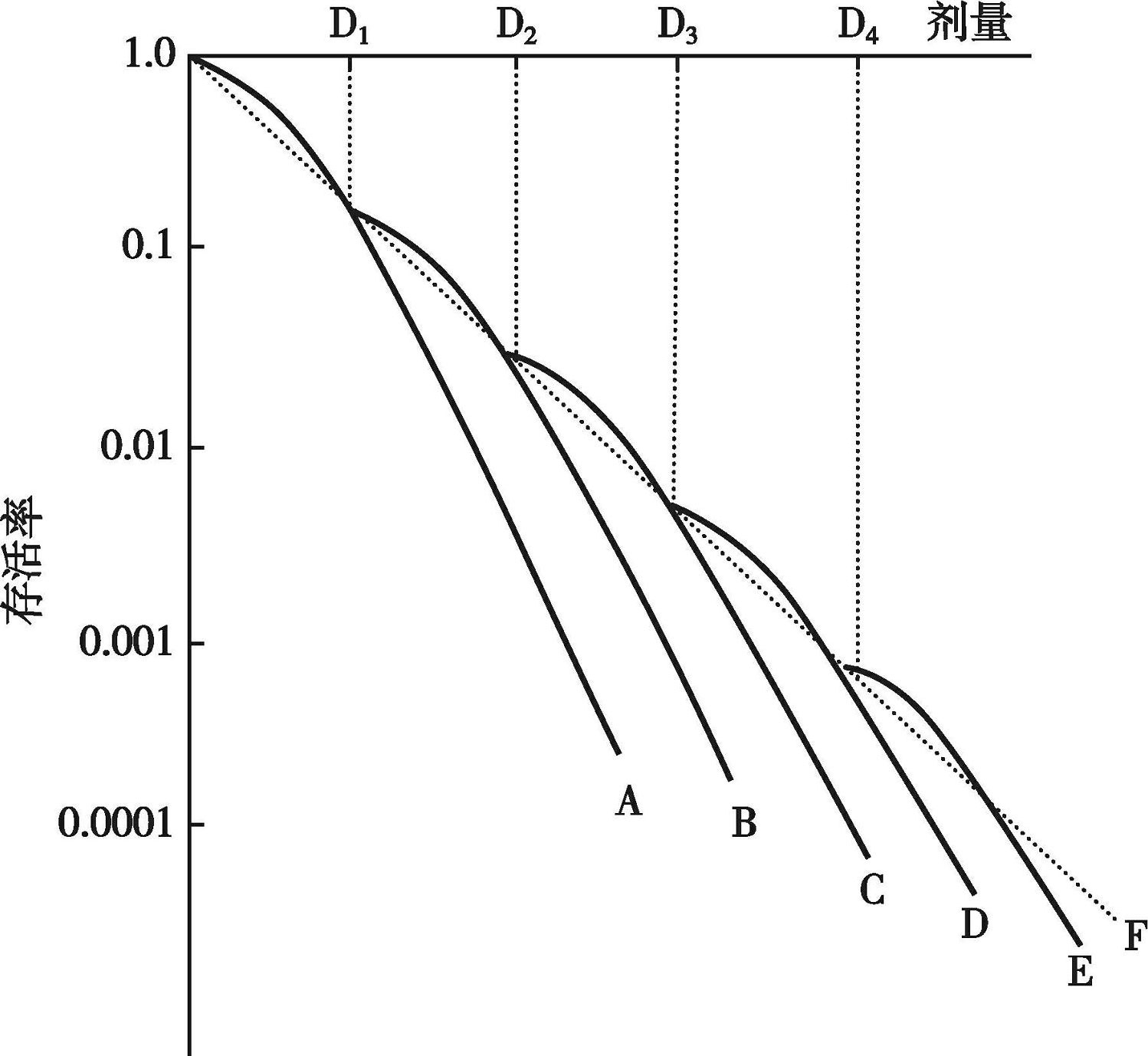 细胞实验结果如图6-3-1所示,单次大剂量照射带来细胞存活分数的急剧下降(如曲线A),若把单次剂量分成许多分次,使在每个分次照射时组织受到的损伤有可能得到部分修复,从而对那些能累积和有效地修复损伤的细胞给予相应的保护(如曲线B、C、D、E)。从组织层面来说,把剂量分成许多分次使在每个分次照射时组织受到的损伤有可能得到部分修复,从而对那些能累积和有效地修复损伤的组织细胞给予相应的保护。总治疗时间的延长让存活细胞能继续繁殖,让亚致死损伤细胞能得到修复,这对于增殖快的组织(如皮肤、小肠黏膜)保存功能来说更为有利。在细胞修复和再群体化之外,分次和总治疗时间的延长还能有利于乏氧细胞的再氧合和导致处于细胞周期的细胞分布的改变,这些因素都会影响组织器官的最终生物学效应。