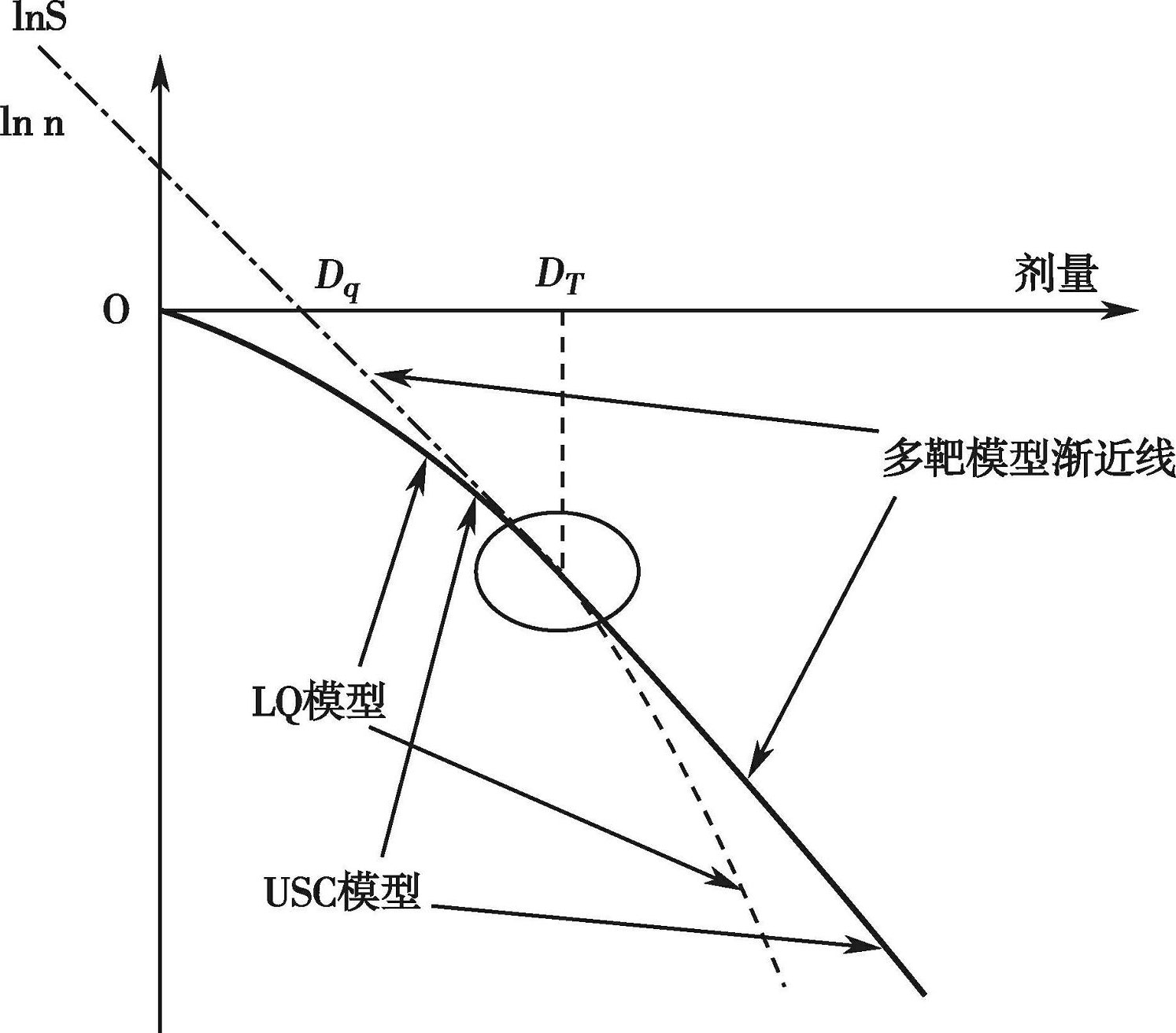 其中, D T 为转换剂量, D 0 为确定曲线最终斜率的参数, D q 为SH-MT模型渐近线的延长线与 x 轴的截距,曲线形态如图6-3-4所示。