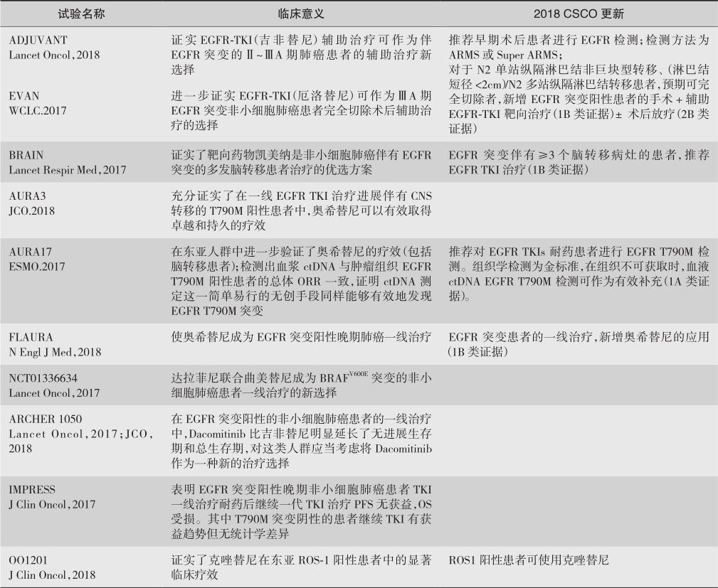 据最新数据统计,2017年全球新发肺癌患者约200万例,死亡人数约为175万例,占所有癌症死亡人数的19.4%,排名第一。我国癌症中心目前发布最新一期中国恶性肿瘤发病和死亡分析报告显示,2014年全国新发恶性肿瘤病例约380.4万例,死亡病例229.6万例。发病第1位的是肺癌,每年新发病例约78.1万。过去的一年里,我国在肺癌治疗领域均取得了较大进展,本文对2017年6月—2018年7月,由中国学者领导或者参与的,且对于中国肺癌临床实践产生影响的临床研究做一个梳理和总结(表1)。