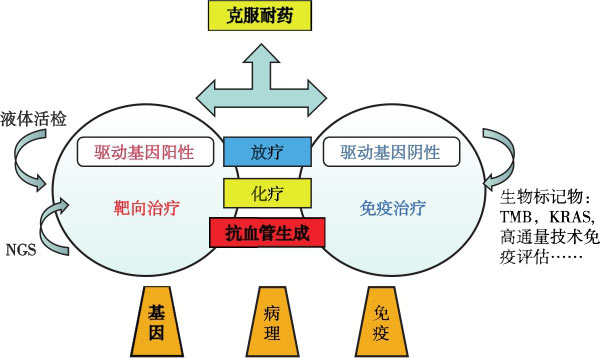 未来肺癌治疗的策略,应以病理,基因,免疫为基石。靶向治疗以液体活检和NGS为左臂右膀,探索最合理的TKI使用秩序,争取最大生存获益。免疫治疗重点在于探索合适的生物标记物以及合理的联合方案,筛选免疫治疗“优势人群”,使驱动基因阴性的患者治疗也能达到“精准化,个体化”(后附插页图5)。当然,耐药是肺癌治疗不可避免的“绊脚石”,路漫漫其修远兮,吾将上下而求索”。