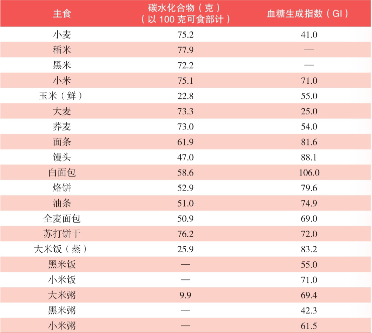 (1)我国居民膳食以大米和小麦为主,谷类中的“糖”主要为淀粉(70%~80%),谷类淀粉是人类最广泛、最经济的能量来源。在各类食物中,谷类碳水化合物含量最高,蛋白质次之,含有少量的脂肪。谷类食物的碳水化合物含量近似,每100克谷类食物大约含70克碳水化合物,详见表1。