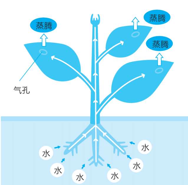 植物的叶子上,分布着许多可以让空气进出的气孔。植物体内的水分变成水蒸气,通过这些气孔排出。这个过程就叫作蒸腾作用。