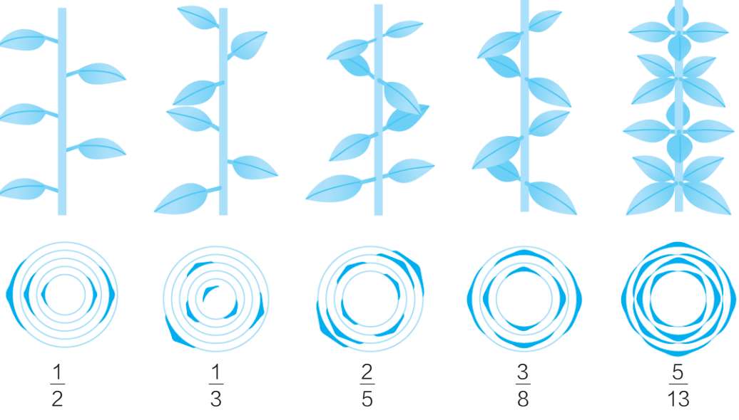 实际上,这组分数的分子和分母,都是各自按照斐波那契数列排布的。植物的叶子按照斐波那契数列分布的这一规律,被称为兴柏-布朗定律。