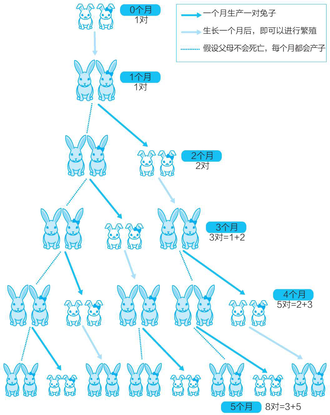 举个例子,我们假设一对兔子在出生一个月后成年,第二个月开始每月生一对兔子。