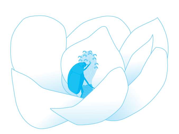 初恋的对象,一般都是不太精明,甚至是有些笨拙的。植物的进化也是一样。就算是在现代,金龟子也绝对算不上精明灵巧。它们没办法像蝴蝶或是蜜蜂那样潇洒自如地在花间纷飞。金龟子通常是以一种近乎坠落的方式,“扑通”一下落在花朵上,然后一边吃着花粉一边在花丛中四处奔走。因此,木兰花是向上开的,并且将无数的雌蕊和雄蕊都杂乱地排在一起,以此让金龟子可以更加方便地行动。