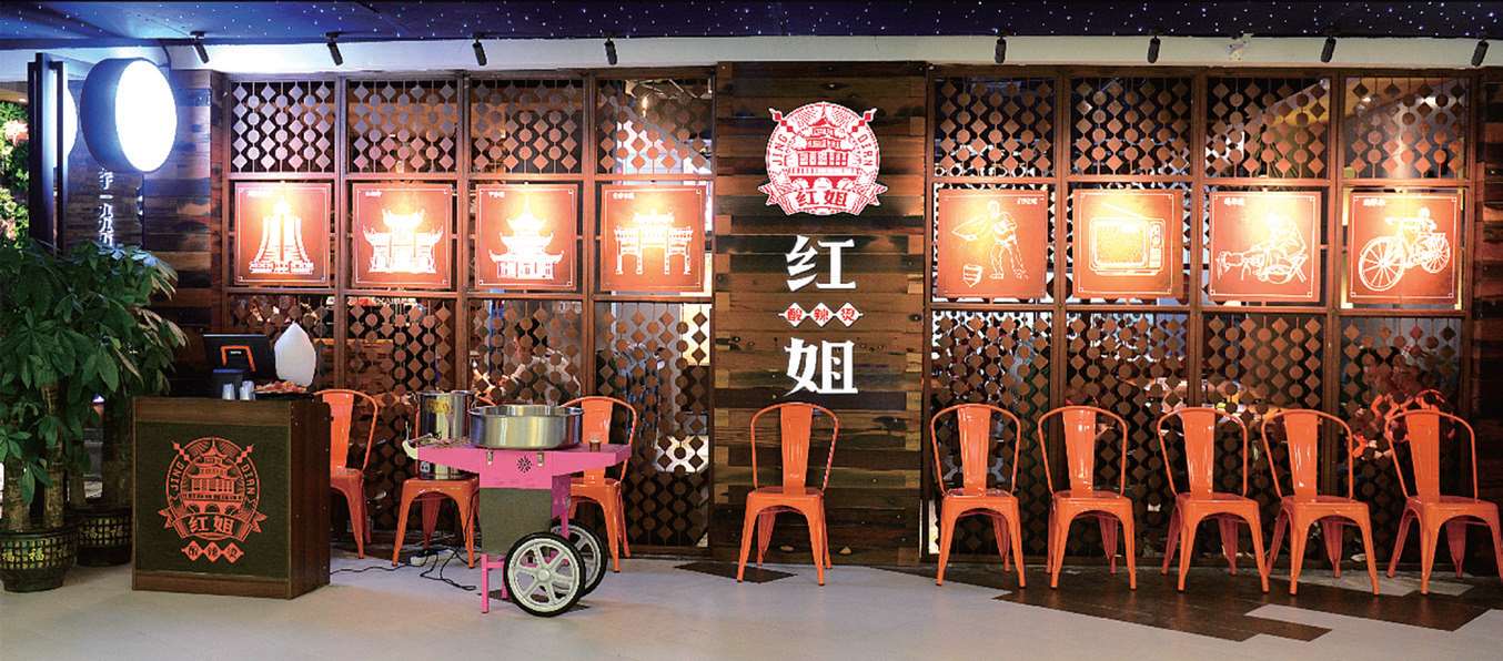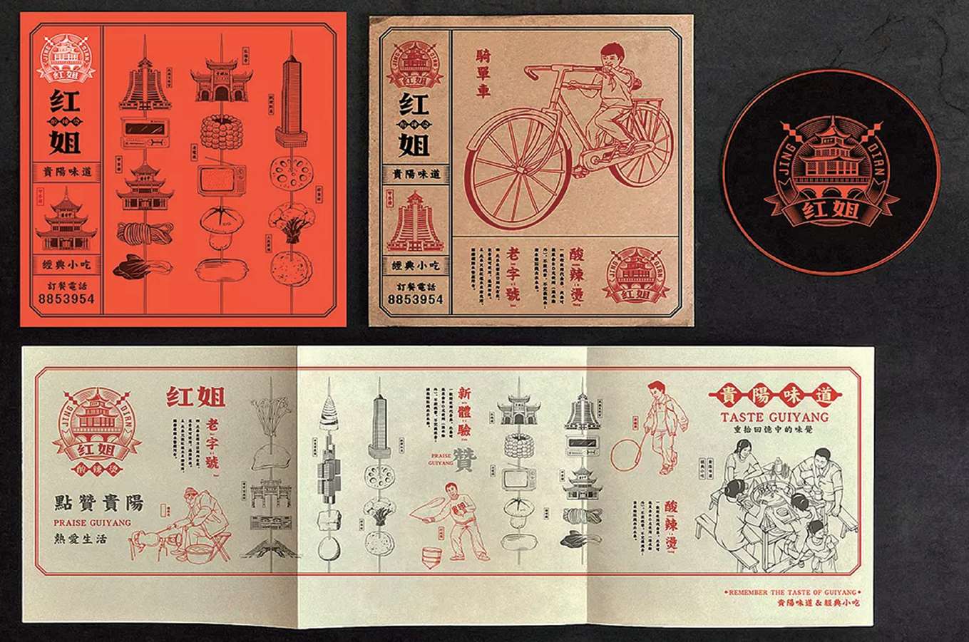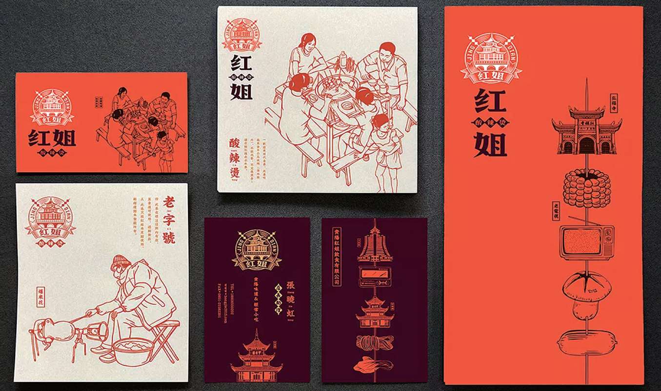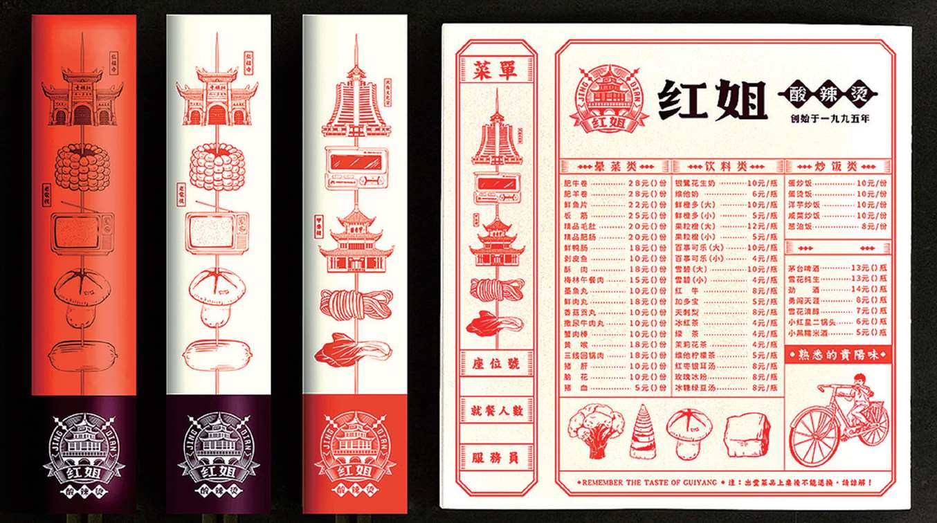 酸辣烫是贵阳的特色名小吃,是用竹签把食物串成串涮火锅的一种吃法。红姐酸辣烫是一家正宗的老贵阳酸辣烫,贵州上行设计在品牌设计的过程中,为了突出老贵阳的文化特点,标志设计的主题元素运用了贵阳的标志性建筑“甲秀楼”,同时将老贵阳的建筑、酸辣烫的食材,以及过去的生活用具和场景,运用怀旧的风格进行设计表现,不仅展现了美食的趣味性与品牌的年代感,还突出了贵阳的地方文化特色。