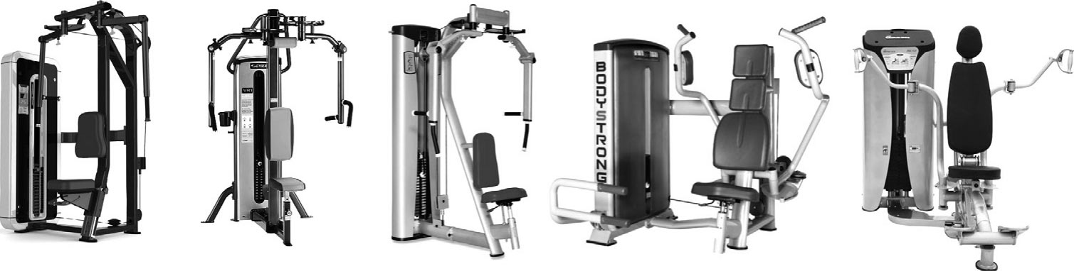 大家看下图,这是一组“长”得不一样的器械,但都是夹胸器,都是用来做夹胸这个动作的。