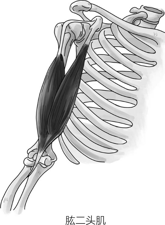 肱二头肌一头连在前臂上,另外一头连在“肩膀”上。所以,它一收缩,一拉紧,我们形成的动作就是前臂向肩膀靠近。