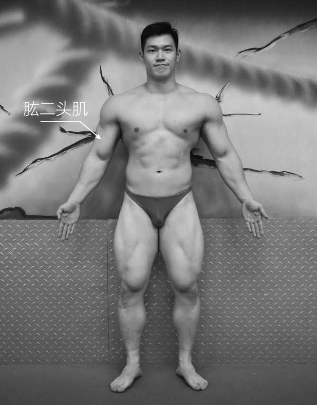 先看解剖图,对应模特图片找到我们的肱二头肌,想象一下,并且试一下,肱二头肌收缩的时候,我们在做什么动作。