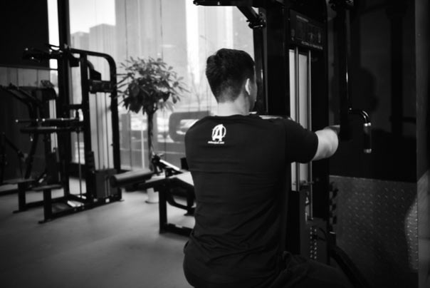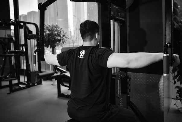 如下图,就是训练三角肌后束的一个动作,把蝴蝶机夹胸反着做。