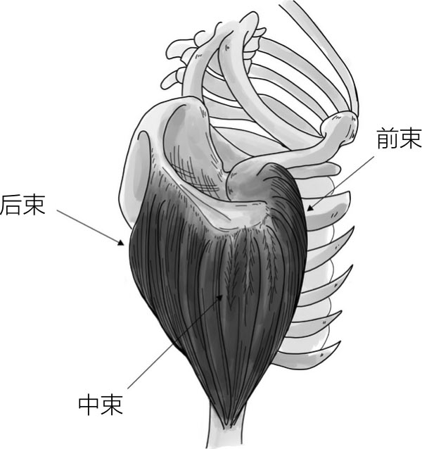 三角肌这三个束,其中一头都连在肱骨上,也就是上臂上。所以我们可以知道,三角肌是负责胳膊活动的。这三个束的另外一头,连在锁骨和肩胛骨上。