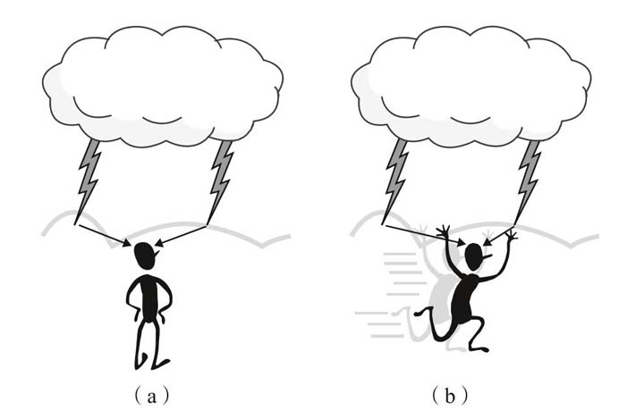 假设你观察到了一个惊人的现象。在一场雷暴中你看到两道闪电同时击中大地,一道在你左边,一道在你右边(见图2)。你完全静止,一动不动,因此两道闪电发出的光到达你所在处需要的时间是一样的。光传播的速度非常快,因此你在闪电出现之后的短短一瞬间就能同时看到它们。