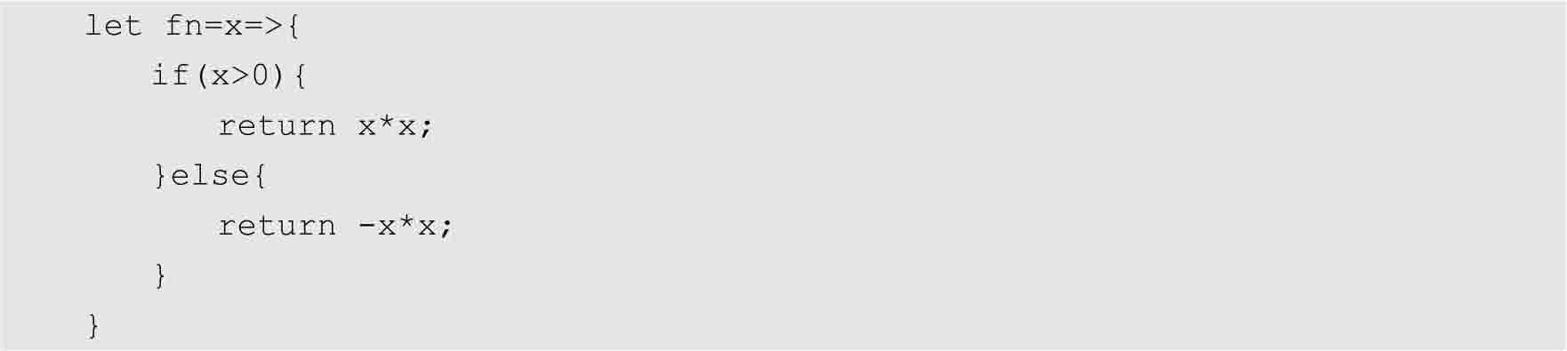 调用函数fn(6),输出结果为36,调用函数fn(-5),输出结果为-25。如果去掉这段代码中箭头后面的大括号{},这段代码就会报错。