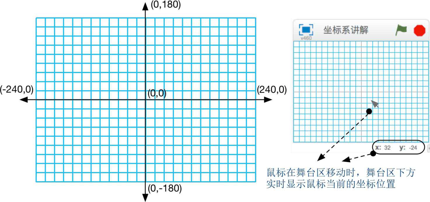从平面坐标系的图可以看出:舞台实际上是一个长度为480、宽度360的长方形。这里的长度单位不是米、厘米之类的长度计量单位,而是像素,它代表的是屏幕上一个点的大小。正中心的点位置坐标为(0,0)即它的X坐标和Y坐标均为0,最右边的中心位置坐标为(240,0),最上边的中心位置坐标为(0,180)。