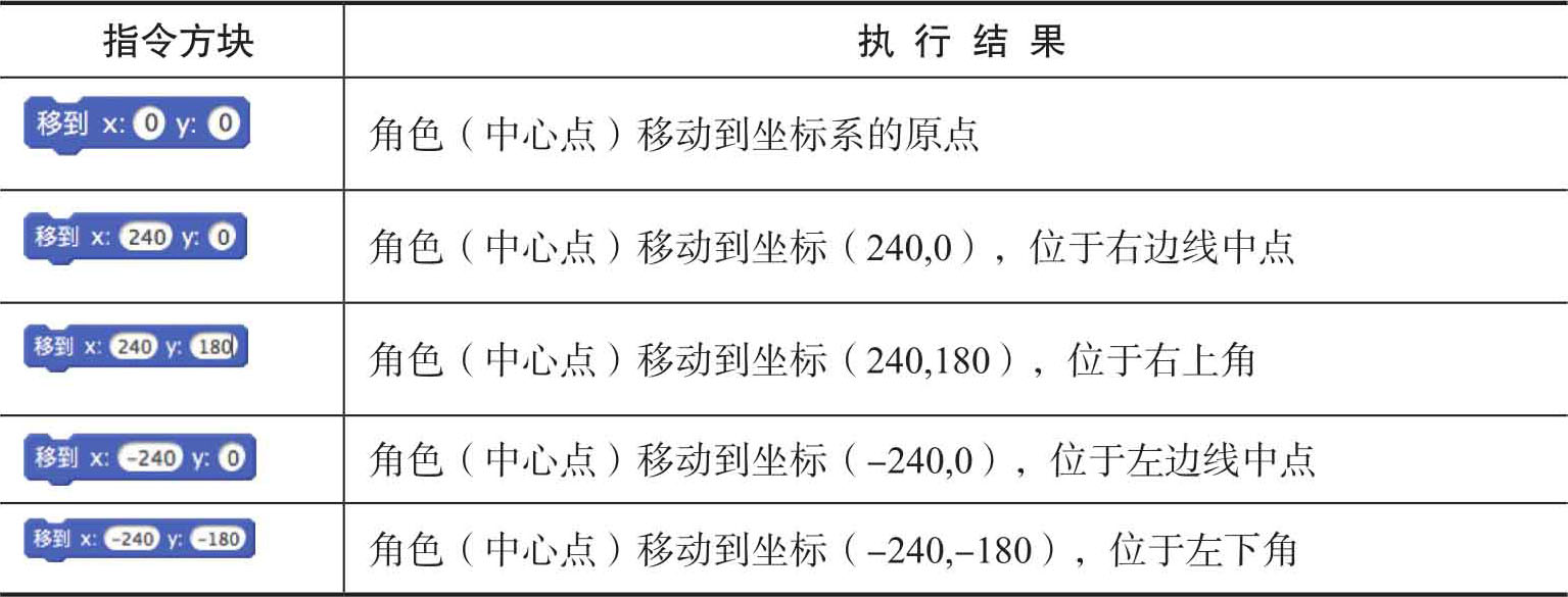 认识了坐标系,就容易理解【移到X:Y:】这样的指令了。因为在舞台上,只要给定了X和Y坐标的具体值,准确位置也就确定了。新建一个角色,然后从指令区拖动表1-2中的指令方块到脚本区并双击指令方块,看看会发生什么。