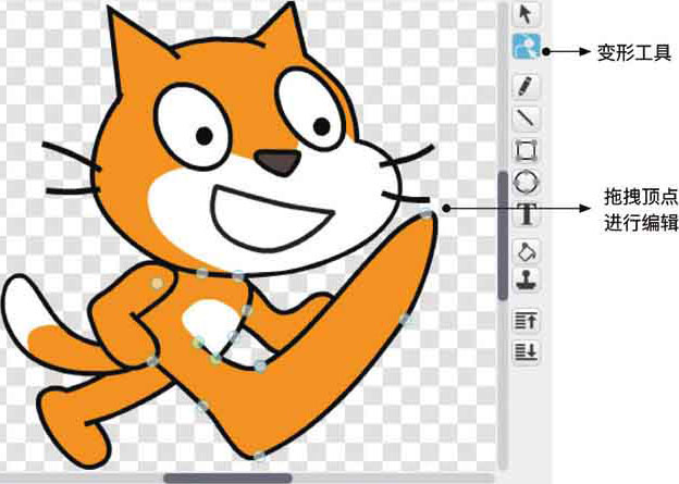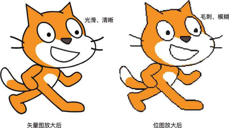 由于矢量图与位图在描述图像方式上的不同,所以两者各有优缺点,例如矢量图可以无限放大而不失真,而位图放大到一定比例就会出现“毛刺”现象(见图2-2);另外,矢量图文件实际是文本格式,所以存储空间的占用要远远小于记录每个像素点颜色数据的位图格式的文件;矢量图还有一个非常大的优势,尤其是在Scratch编程中,它可以支持后期的图像编辑,而位图格式的文件就无法做到这一点,矢量图的这一特性在动画软件的制作中,特别适合用来绘制各式各样的新奇的图像。图2-3演示了使用矢量图面板上的“变形工具”拖拽小猫图像脚部顶点进行图像编辑。